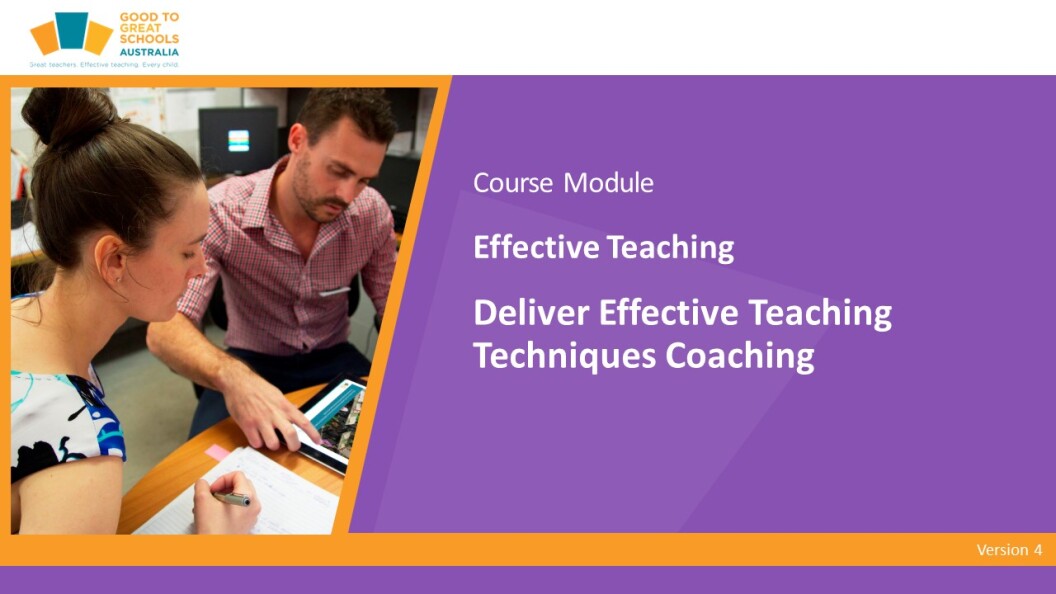 Coach Effective Teaching Techniques is a professional learning module for instruction coaches. Participants understand the critical role of coaching to build a positive high-expectations school that cohesively delivers effective teaching. They can conduct observations and use the data in communicating to teachers and teaching assistants about their practice. They learn how to plan and deliver coaching sessions to support the school team in delivering effective teaching so that their teaching is more effective and student results are lifting across the school.